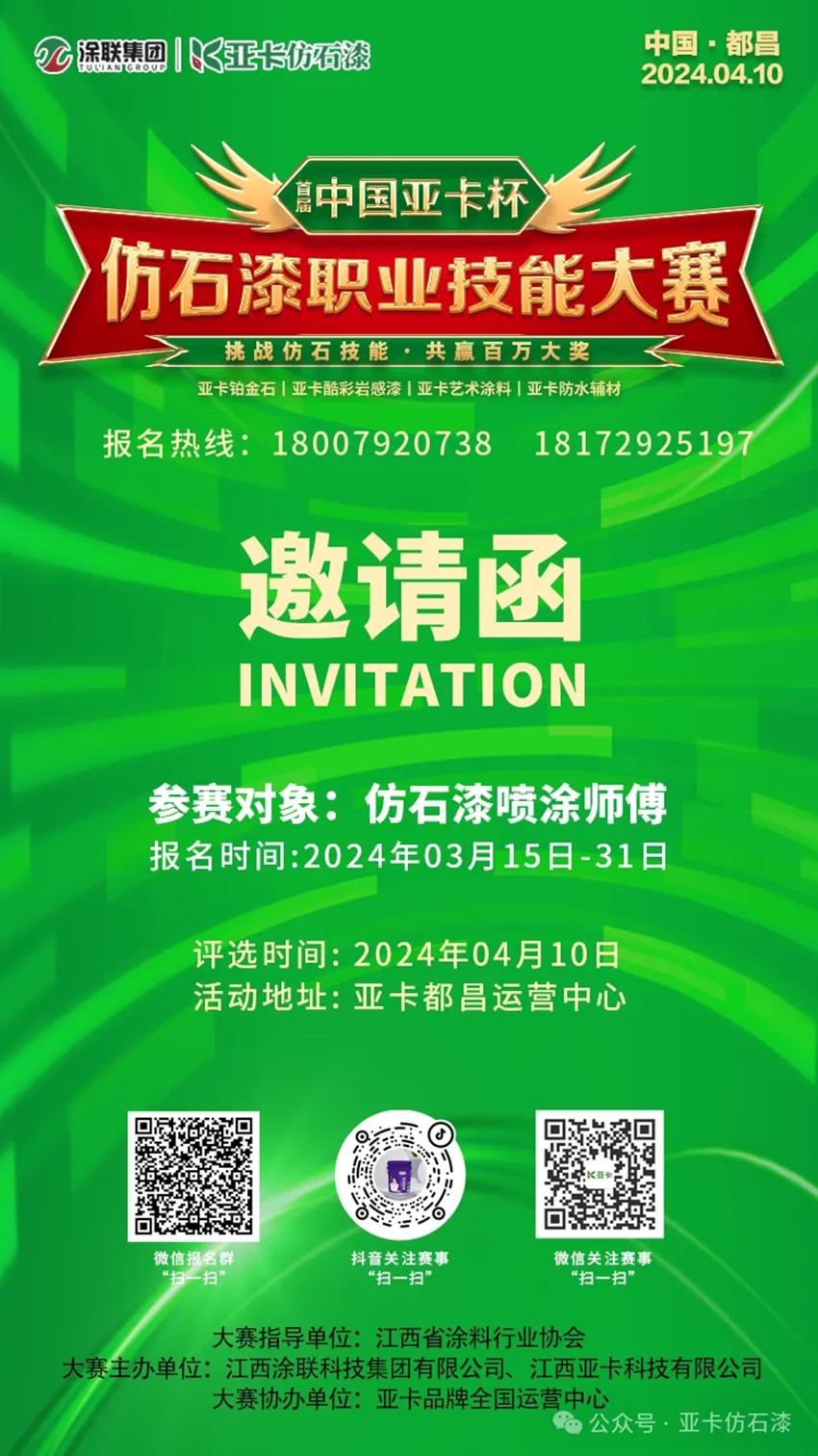 2024年3月,首屆“中國亞卡杯”仿石漆職業(yè)技能大賽正式在全國各省市運營中心全面啟動,目前正火熱報名中,本次大賽為“中國亞卡杯”仿石漆賽道的首次實操類競賽,將組織上千名仿石漆噴涂技能選手參賽,打造亞卡仿石漆噴涂行業(yè)高素質競技平臺,選拔優(yōu)秀技能人才,推動行業(yè)創(chuàng)新發(fā)展